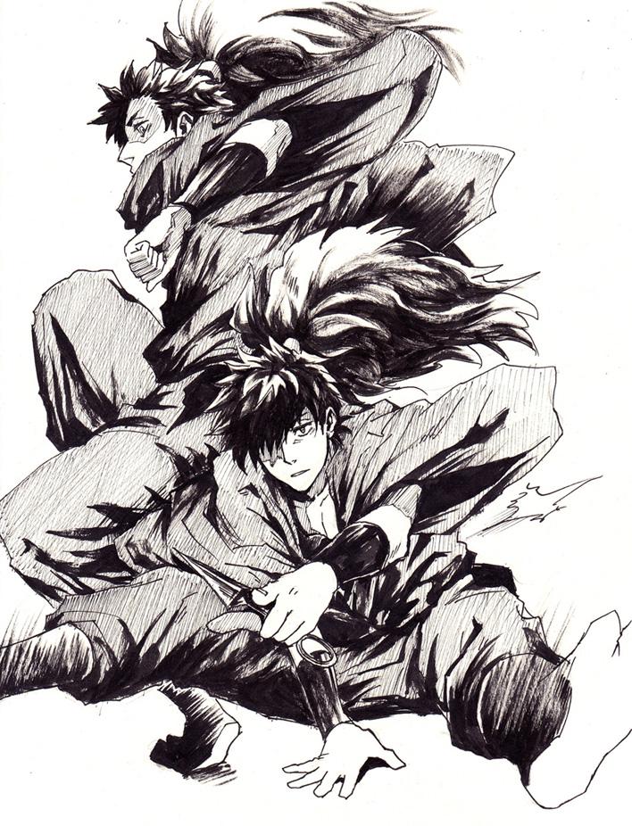 そしてそして11/21のお礼イラストです^^なんか漫画描いてみて、自分には画面を保たせるだけの白黒力がないなあーと思ったので最近もっぱらモノトーンです。筆ペンが大好きなんですけどね、難しいです、精進します(汗)こう三郎が敵が飛ばしたクナイをぱしっと取って雷蔵と助太刀に登場したら……格好良くありませんかっていう絵です♪そんな訳で改めて御礼申し上げます、ありがとうございました!!
