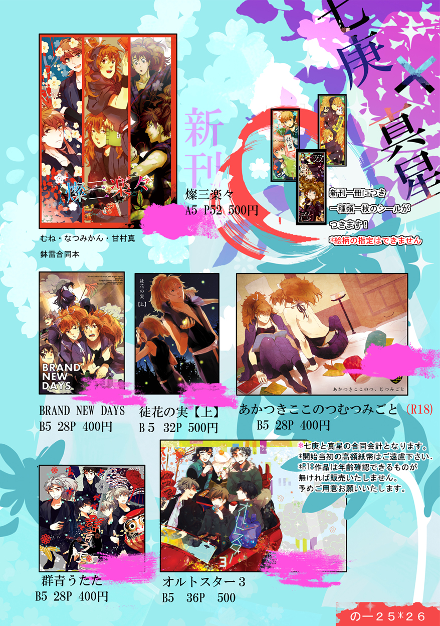 私は真とむねとの合同誌でのみの参加となります。スペースは【真星/の25】【七庚/の26】の合同スペです。このサンプルは私の描いたページになりますので、それぞれのサンプルはご本人のページでご確認下さい。因みに私の描いたものは成長パロになりますのでご注意下さい。当日はノベルティーが付きます。