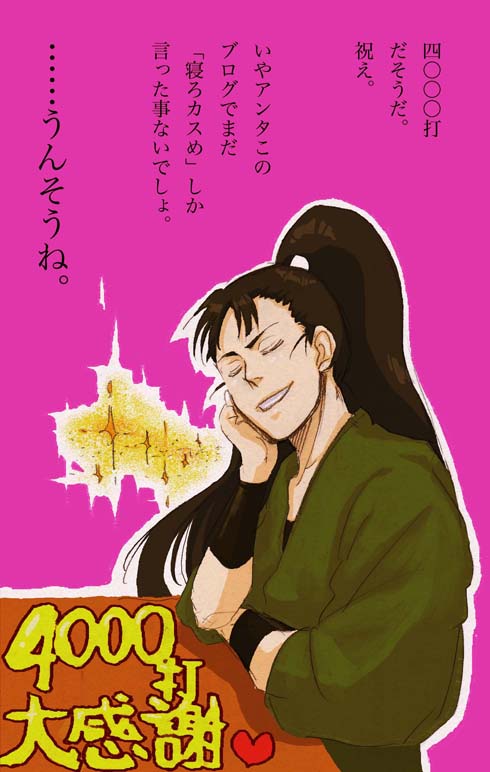 今正月絵描いております☆間に合うかは分かりませぬ^^;で、「あ、4000打。」ということでたった今描きましたww出来たてほやほや。さすがに年内にはやっときたかったので。しかもまさかの5年オール・ナッシング。どんな形でもいいから年内に5年もう一回描いときたい><