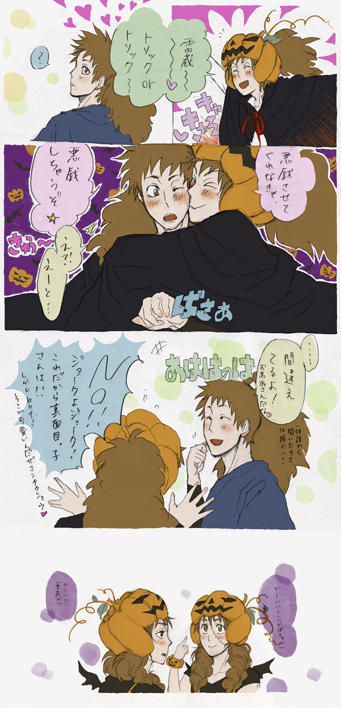 そんな訳で本当ささやかですがハローウィンネタです。三郎の外人ノリが若干鼻につくのはさておき、一番下のコマの二人の服装はなつみかんが太古の昔に描いたオリキャラの格好という、大層私向けのものですすんませーん。自重を心がけます^^