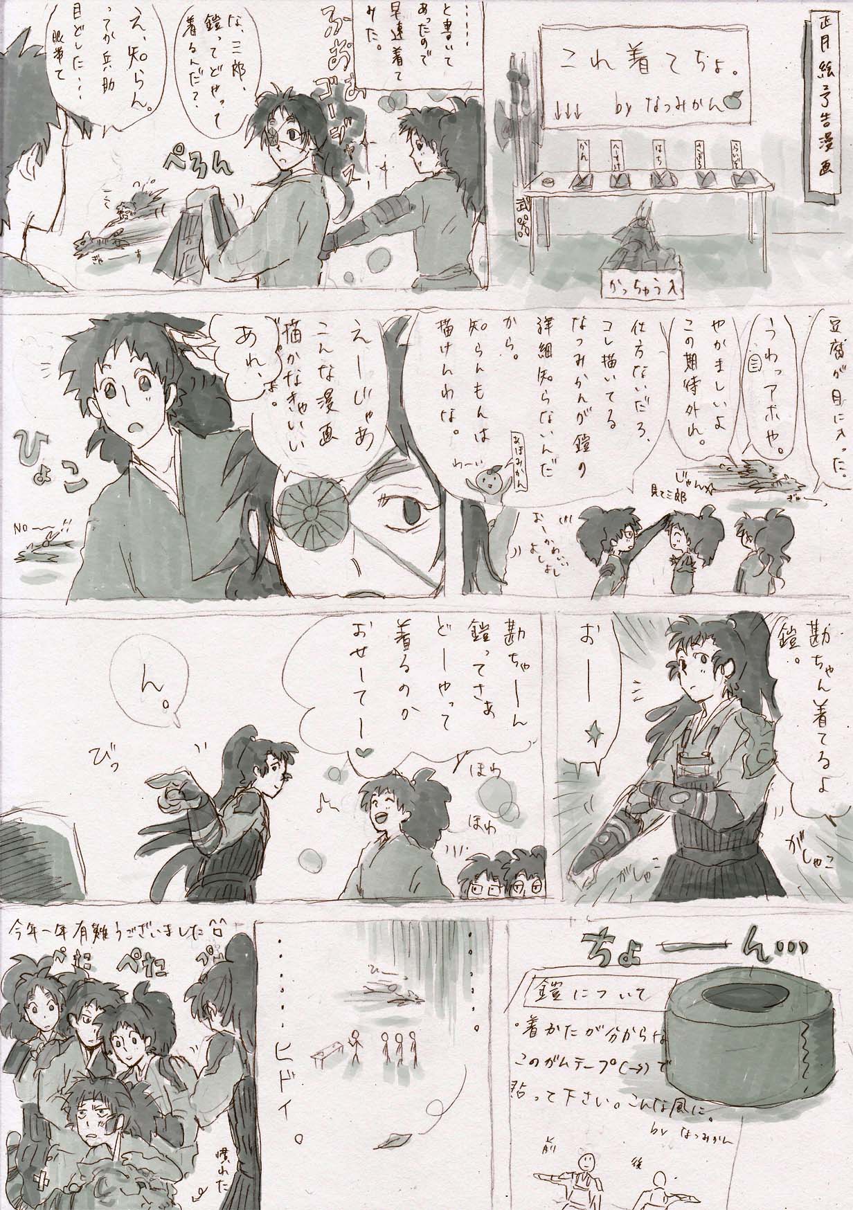 ちょっと雑になってしまいましたが正月絵です!5年は毎回青なんで、折角の正月ということもあり、赤色メインにしてみました^^皆なかなか似合わなくてねww思いもよらないところで苦労するはめになりました☆