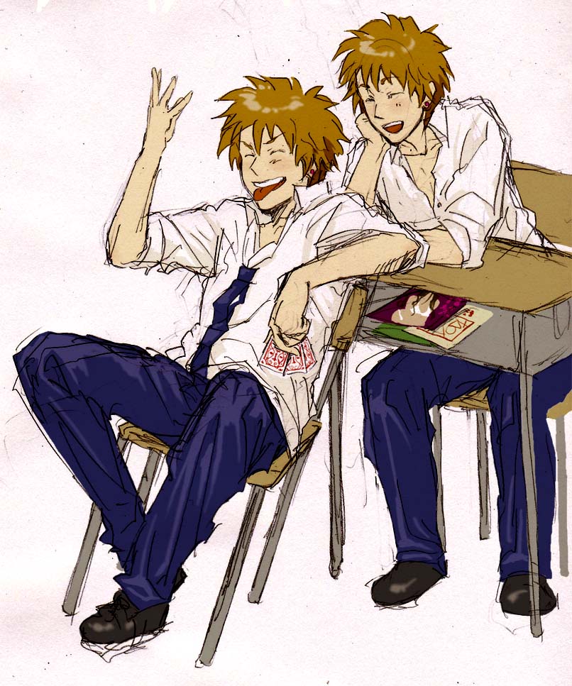 折角だからなんかあげたいよな〜〜と思って、現パロ双忍あげてみた^^三郎が若干欧米ノリになってる事はさておき、休み時間にトランプ、主にババ抜きやってたら可愛いですよね><三郎はジョーカー引かないし、引かせるのも巧い。でも雷蔵が一生懸命細工してこっちにトランプ向けてきたら迷わずジョーカー取るね奴は。そんな訳で雷蔵は早々に上がって、次に三郎が小憎たらしく上がります。となると残るのは……生物を大事にするアイツですwwそんな竹谷も描けばよかった、ちょっと後悔。ここに兵助とか勘ちゃんが参戦してくると、三郎も割りと思い通りにいかなくなる。兵助はポーカーフェイスだし、勘ちゃんはニコニコ鉄仮面だから表情になかなか出て来ないという。なんだかんだで妄想は毎回全員参戦になるな……