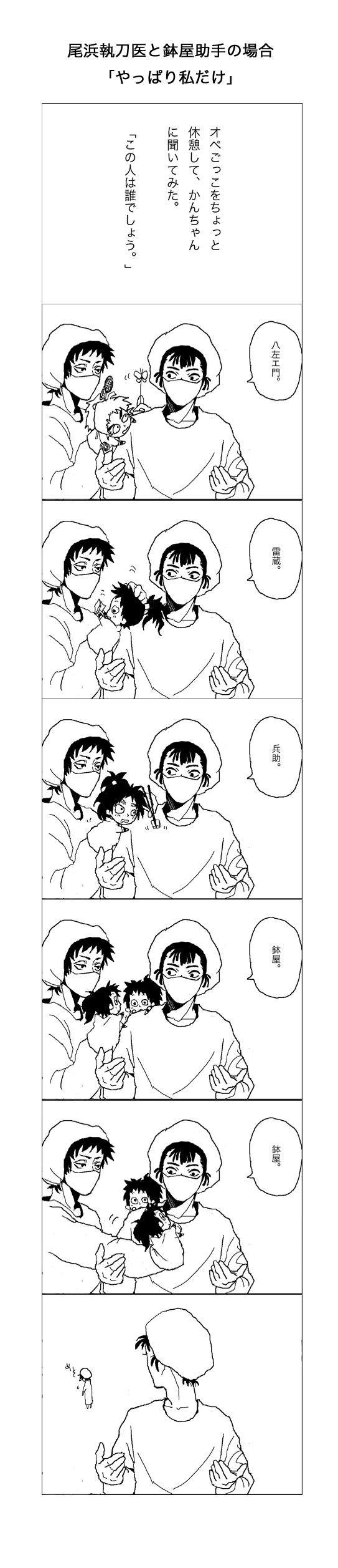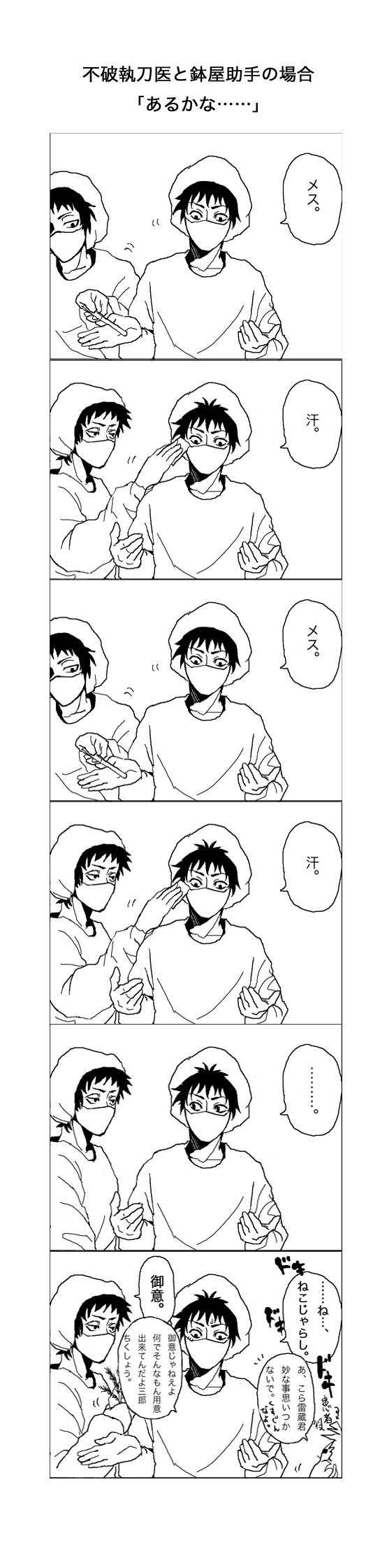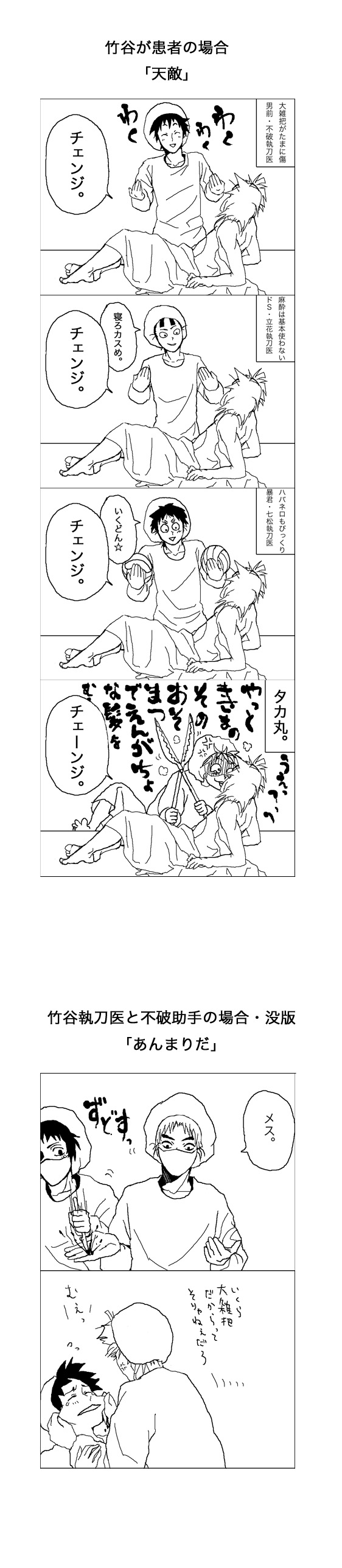 そんな訳で忘れた頃にやってきました、尾浜執刀医。以前三郎と勘右衛門はおいしいよねとかなんとか言っておりましたが、こんなんになっちまっただーよ。こんな筈じゃあなかっただーよ。なーんてこったーい。