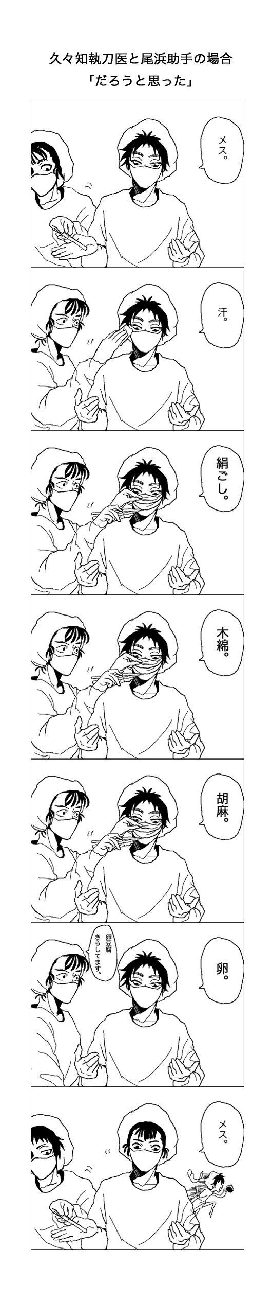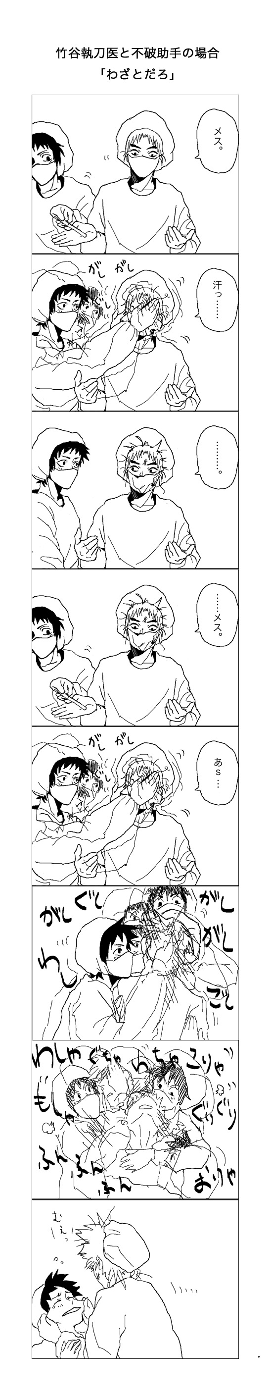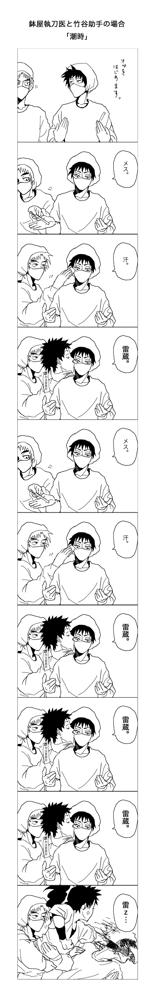 そんなこんなでオペシリーズ第3段、八左執刀医です。八左は雷蔵と組むと散々な目に会うんじゃないかな、ってか会いなさい、おもろいから。勿論、雷蔵に悪気など毛頭ございません。自分ではしっかりした一般常識人だと激しく思い込んでるぼけぼけ雷蔵が大好きですだよ^^そして、まだまだ続く。続くったら続く。