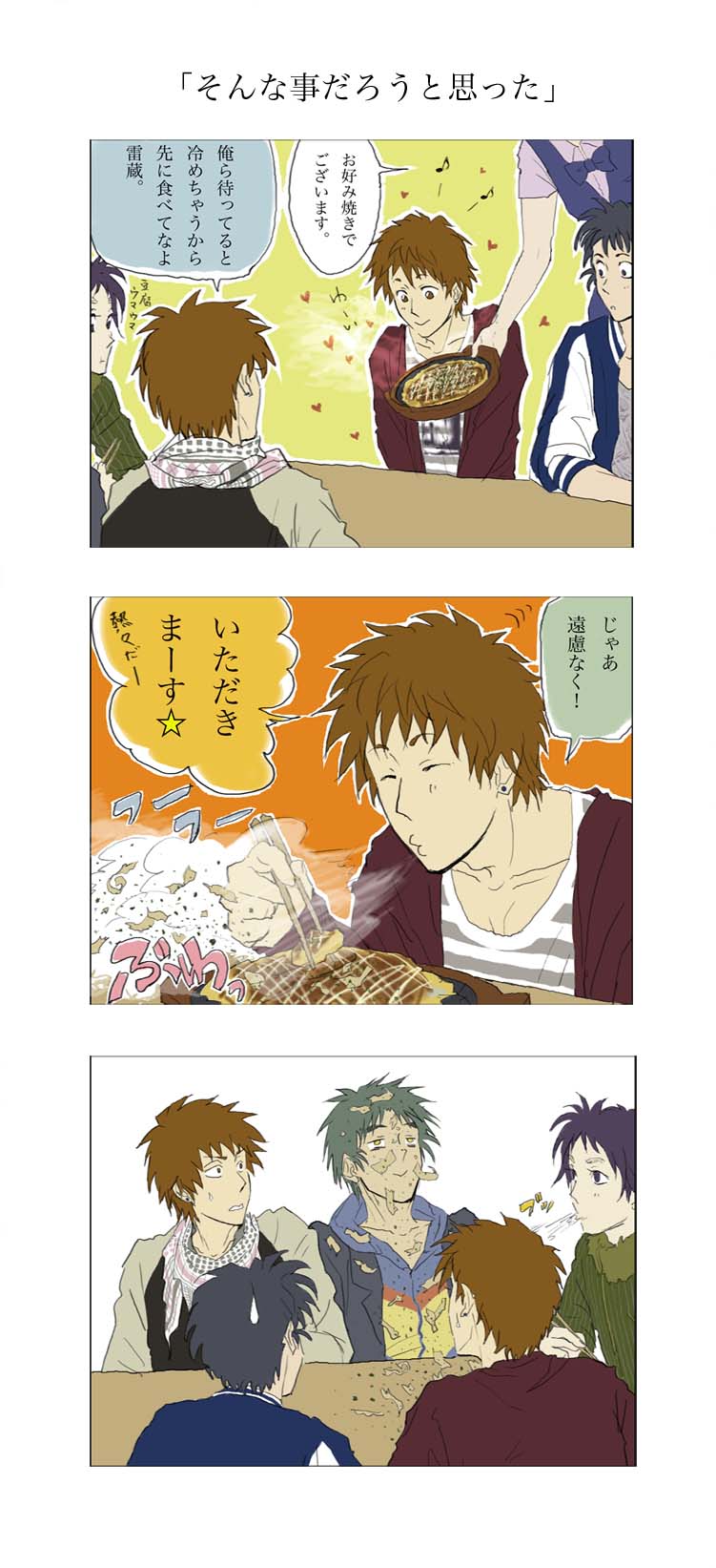 以前話した熱々のチーズスフレの件を雷蔵にやらせたらこうなりました。私服の色を塗るのが面倒臭過ぎる事以外は順調でしたよ。私服は毎回悩みます、色々着せてみたいから^^今回はまあ……こんな感じになりました☆兵助と勘ちゃんは何気に初めて現パロで描いたような気がする。また時間があったらどんどん描きたいですね現パロ♡