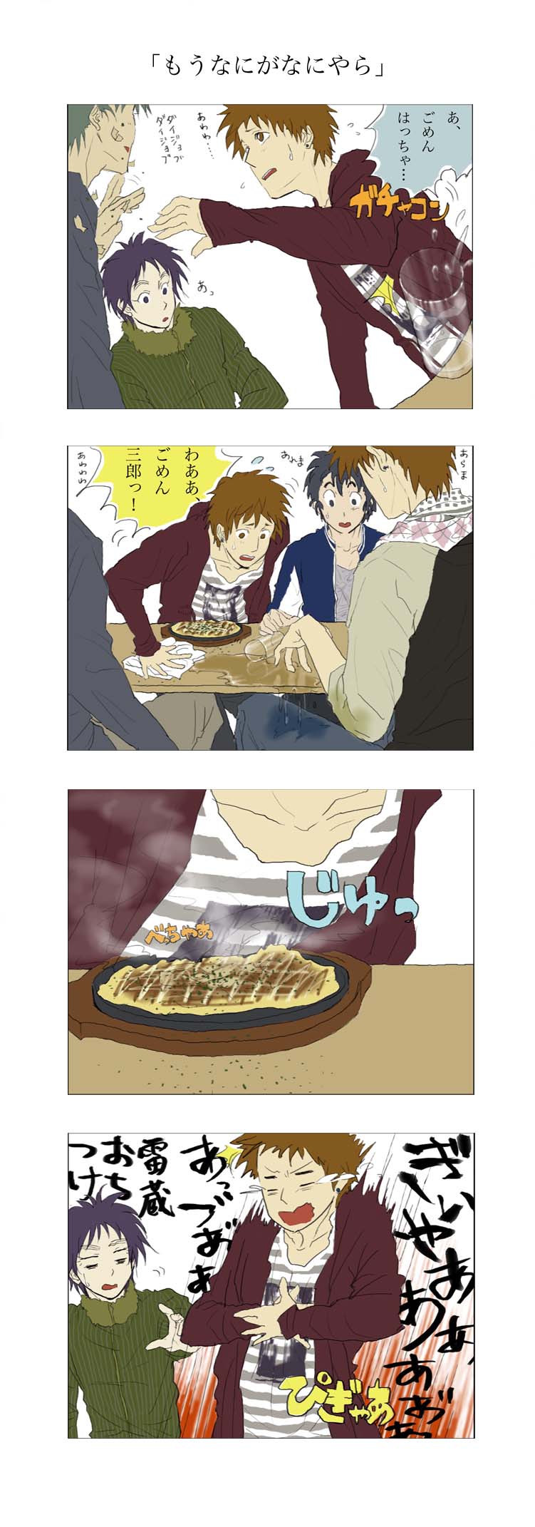 前回のおまけ的なもののつもりで描いたものですが、もう完全にこっちの方が手間がかかってしまった……不破パニ蔵です。雷蔵は普段は割りとおかんだけど、パニくるともう訳分かんなくて前後不覚になりそう。それはもうドミノ倒し的に次から次へとやらかして最終的にはどーんてなるwwその様子を見て、普段はろ組に任せてぽへっとしている兵助も「ま、ま、雷蔵」と宥める側につく。そんな感じがいいです私(希望)普段は割りとフリーダムな兵助だけど、雷蔵には弱そう。で、三郎が兵助に弱い。そんな感じです^^