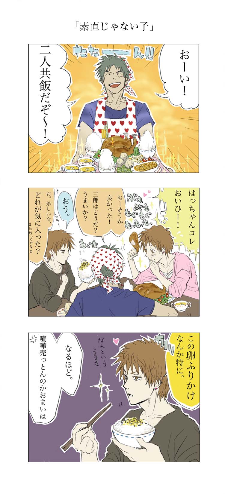 地味に続いています現パロ。三郎はおいしいって思っても決して素直に言わない。でも茶化してくるのは本心を隠してる時だって皆知ってるから、竹谷も口では怒ってるけど実は全然怒ってない。ろ組はそれくらいお互いを理解し合ってていいと思う^^