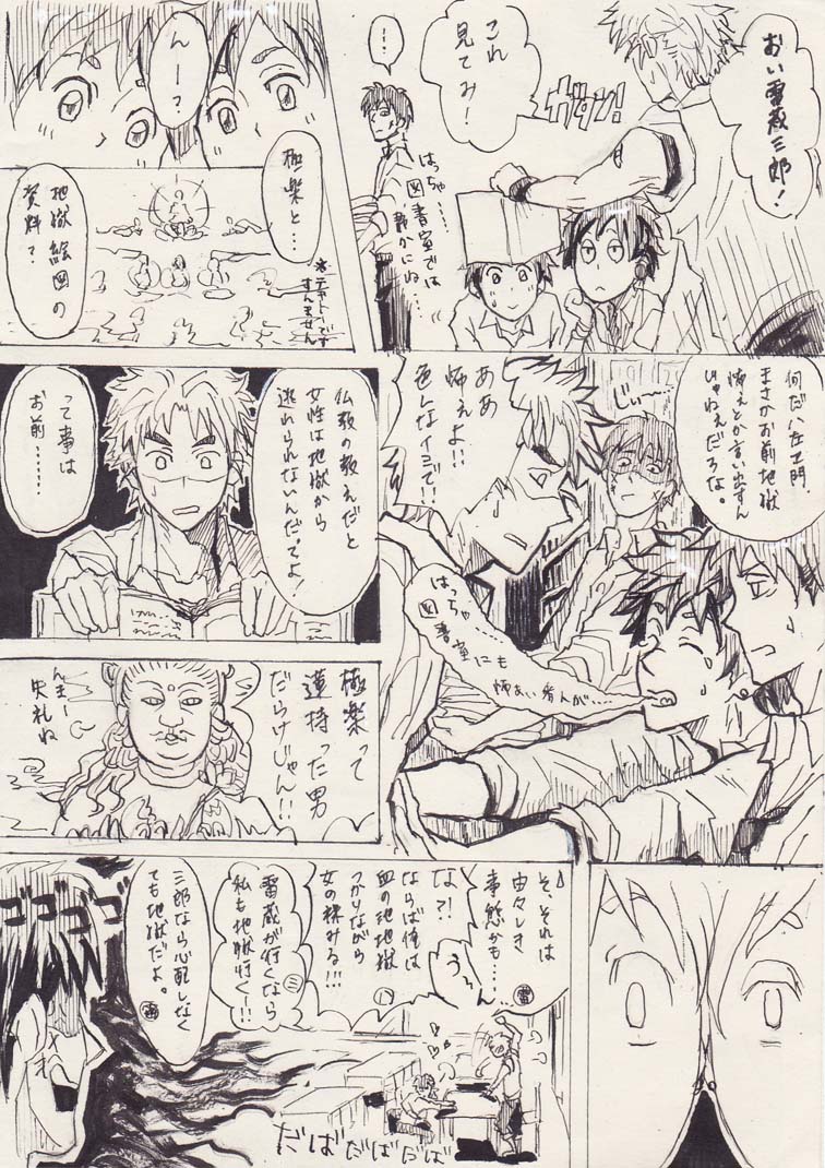 で、早々に質より量なカンジですが五のろの現パロ漫画です。こんな会話をテレビ見ながら正月弟としてました。まあ詳しく話すと長くなるんで止めときますが、なんでも仏教では女性は出産の血などが不浄で、女性は皆「血の池地獄」に墜ちるそうで(問答無用)極楽へいくのはそこで罪を報いた(?)あとなんだそうです。しかも子供を産まなかった女の人には「産まず女地獄」というのも待ってますんな理不尽な。まあそんな番組を見ながら弟が叫んだ言葉を竹谷に言わせたとそういう訳ですww