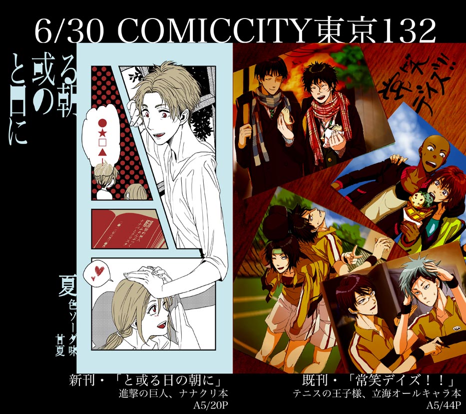 6/30のシティにて友達のスペースにナナバさんとクリスタちゃんの突発本(新刊)とテニス立海本(既刊)を置いていただけることになりました^^ものすごく急ですが進撃のナナバさんにドハマりしてしまい……なんて格好いいんだナナバさん!!アニメではまだ出ていない原作キャラなのでネタバレしたくない方はご注意下さい。詳細は以下になります。