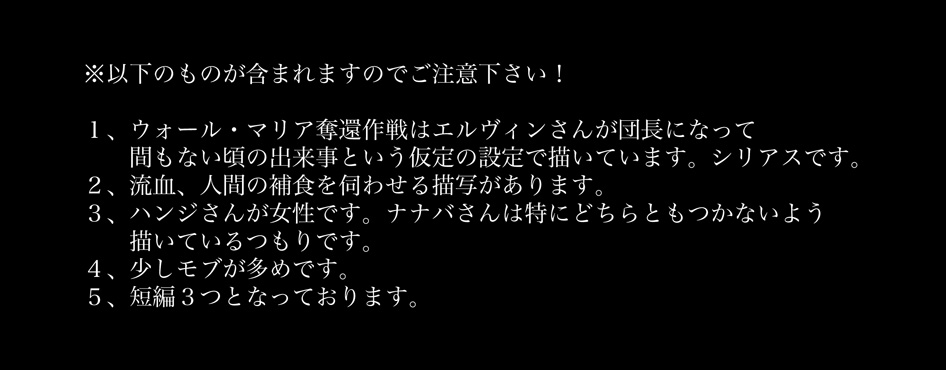進撃の調査兵団幹部組+ナナバさんメインのウォール・マリア奪還作戦の時の本となっております。流血表現なども含みますので注意文を読んで判断していただけたらと思います。当日はこんな感じです☟