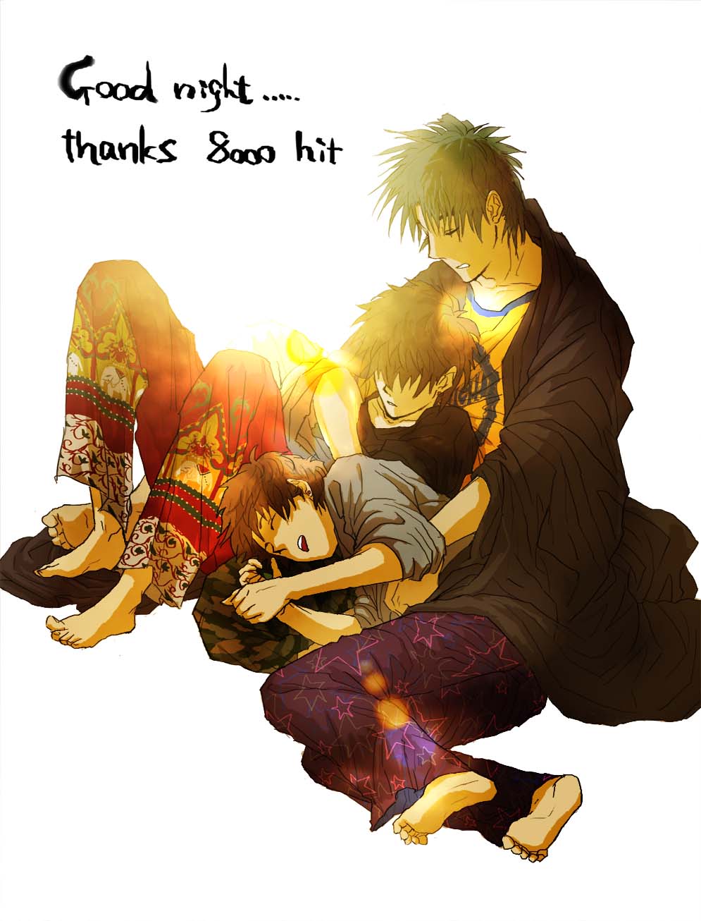 ろ組のパジャマパーチー。というかパジャマどんなの着るかなーという妄想絵ですww八左は少し前まで自分が着ていた私服をそのまま寝間着にしそう。ズボンは断然迷彩柄を推します^^で、夏は適当なTシャツ、冬はパーカー。色は派手め。全体的に子供っぽい格好のお兄さんになって欲しい八左です。三郎は全身真っ黒か、ジャージを想像してたんですけど、絵的にあまりにも物悲しいのでアジアンテイストにしてみました^^三郎は柄ものとかも似合って割りとチャラめの印象があるからこそ、時たま着て来るシンプル・イズ・ベストな格好にしてやられそうな気がする(私が)相変わらず考え方がギャプ萌え星人。まあどちらにせよ、三郎好き(知ってる)雷蔵はポップな可愛い柄のズボンとかいっぱい持ってそう><今回は手描き風のお星様柄です☆やっぱり雷蔵は明るい柄のがいいかなーと^^まあ逆にこっちがジャージか、もしくは無地Tシャツ&ジーンズとかでもいいかも知れない男前で♡アメリカンですね^^でもたまにやるんですけど……ジーンズって寝ずらいし描きずらい、という理由でやめましたww特に後者。本当に駄々っ子駄々子です^^