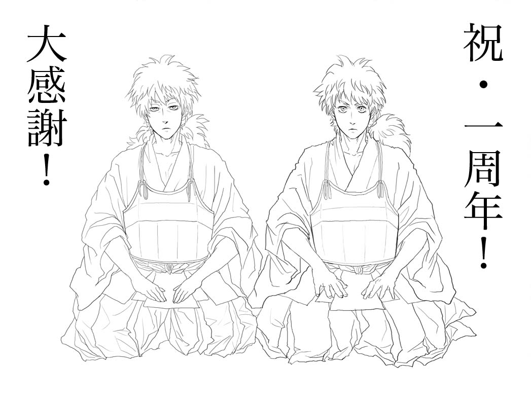 そんな訳で珍しく根詰めて記念絵を描いておりますが、例によってちいとも間に合わなかったので、今描いている絵のボツになったものを再利用。ボツになった理由は三郎が仏頂面だからです。折角の一周年になんでこんな仏頂面を描いたのかww神のみぞ知るところです。ってか普通に真面目な顔描こうとして撃沈しただけっていう。どーん。そんな訳で、例によって出来上がったらアップさせていただきます^^